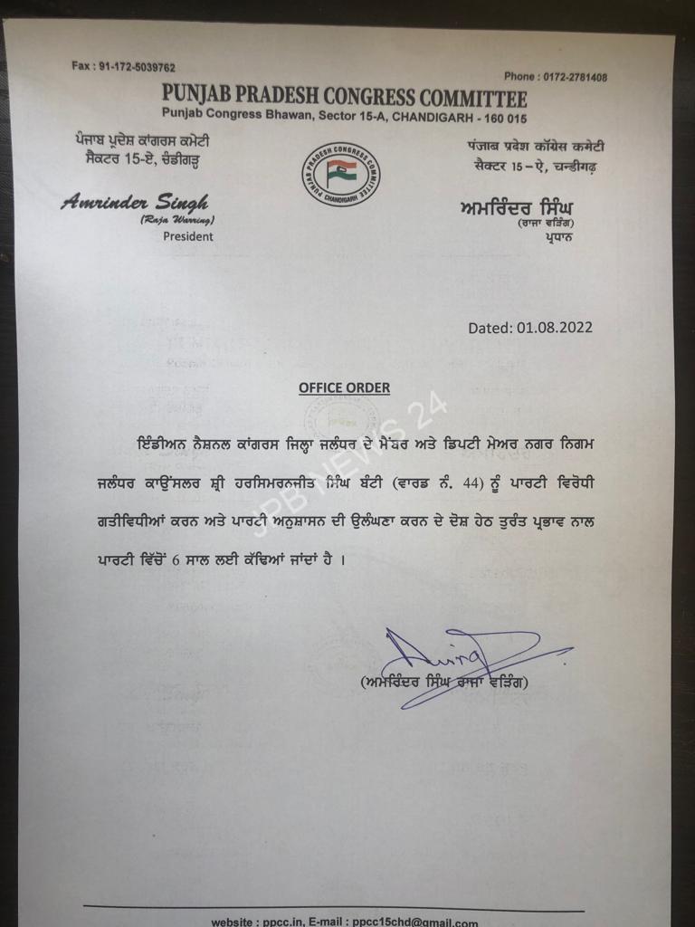 ਜਲੰਧਰ (ਜੇ ਪੀ ਬੀ ਨਿਊਜ਼ 24 ) : ਡਿਪਟੀ ਮੇਅਰ ਹਰਸਿਮਰਨਜੀਤ ਬੰਟੀ ਦੇ ਅਸਤੀਫੇ ਤੋਂ ਬਾਅਦ ਕਾਂਗਰਸ ਪਾਰਟੀ ਵੱਲੋਂ ਪੱਤਰ ਜਾਰੀ ਕੀਤਾ ਗਿਆ ਹੈ। ਇਸ ਪੱਤਰ ਵਿੱਚ ਲਿਖਿਆ ਗਿਆ ਹੈ ਕਿ ਪਾਰਟੀ ਵਿਰੋਧੀ ਗਤੀਵਿਧੀਆਂ ਕਾਰਨ ਉਨ੍ਹਾਂ ਨੂੰ 6 ਸਾਲ ਲਈ ਪਾਰਟੀ ਵਿੱਚੋਂ ਕੱਢ ਦਿੱਤਾ ਗਿਆ ਹੈ। ਪੱਤਰ ‘ਚ ਬੰਟੀ ‘ਤੇ ਅਨੁਸ਼ਾਸਨਹੀਣਤਾ ਦਾ ਦੋਸ਼ ਲਗਾਇਆ ਗਿਆ ਹੈ। ਪੱਤਰ ‘ਤੇ ਸੂਬਾ ਕਾਂਗਰਸ ਪ੍ਰਧਾਨ ਅਮਰਿੰਦਰ ਰਾਜਾ ਵੜਿੰਗ ਦੇ ਦਸਤਖਤ ਹਨ। ਇਸ ਪੱਤਰ ਨੂੰ ਕਾਂਗਰਸੀ ਵਰਕਰਾਂ ਵੱਲੋਂ ਵੱਖ-ਵੱਖ ਵਟਸਐਪ ਗਰੁੱਪਾਂ ਵਿੱਚ ਸਾਂਝਾ ਕੀਤਾ ਜਾ ਰਿਹਾ ਹੈ।