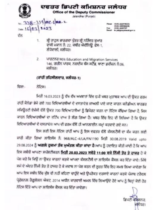 जालंधर ( जे पी बी न्यूज़ 24 ): ਕੈਨੇਡਾ ਤੋਂ 700 ਵਿਦਿਆਰਥੀਆਂ ਨੂੰ ਡਿਪੋਰਟ ਕਰਨ ਦੇ ਮਾਮਲੇ ‘ਚ ਜ਼ਿਲ੍ਹਾ ਪ੍ਰਸ਼ਾਸਨ ਦੀ ਵੱਡੀ ਕਾਰਵਾਈ ਦੇਖਣ ਨੂੰ ਮਿਲੀ ਹੈ। ਦੱਸਿਆ ਜਾ ਰਿਹਾ ਹੈ ਕਿ ਜਲੰਧਰ ਦੇ ਡਿਪਟੀ ਕਮਿਸ਼ਨਰ ਜਸਪ੍ਰੀਤ ਸਿੰਘ ਨੇ ਉਕਤ ਇਮੀਗ੍ਰੇਸ਼ਨ ਦਫ਼ਤਰ ਦੇ ਮਾਲਕ ਖ਼ਿਲਾਫ਼ ਨੋਟਿਸ ਜਾਰੀ ਕਰਕੇ ਲਾਇਸੈਂਸ ਮੁਅੱਤਲ ਕਰ ਦਿੱਤਾ ਹੈ।ਨੋਟਿਸ ‘ਚ ਸਾਫ਼ ਤੌਰ ‘ਤੇ ਲਿਖਿਆ ਗਿਆ ਹੈ ਕਿ 20 ਤਾਰੀਖ਼ ਤੱਕ ਆਪਣਾ ਸਪੱਸ਼ਟੀਕਰਨ ਦਿਓ।