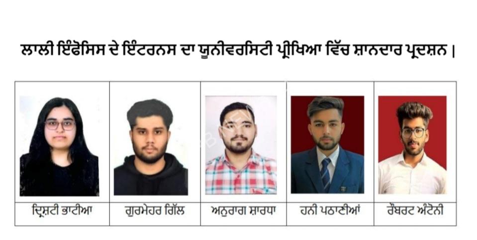 ਲਾਲੀ ਇੰਫੋਸਿਸ ਦੇ ਵਿਦਿਆਰਥੀਆਂ ਦਾ ਯੂਨੀਵਰਸਿਟੀ ਪ੍ਰੀਖਿਆ ਵਿੱਚ ਸ਼ਾਨਦਾਰ ਪ੍ਰਦਸ਼ਨ